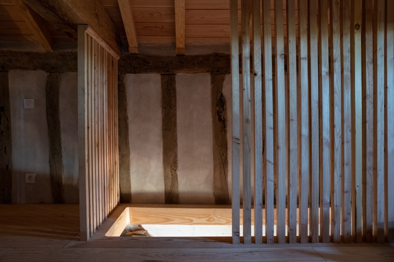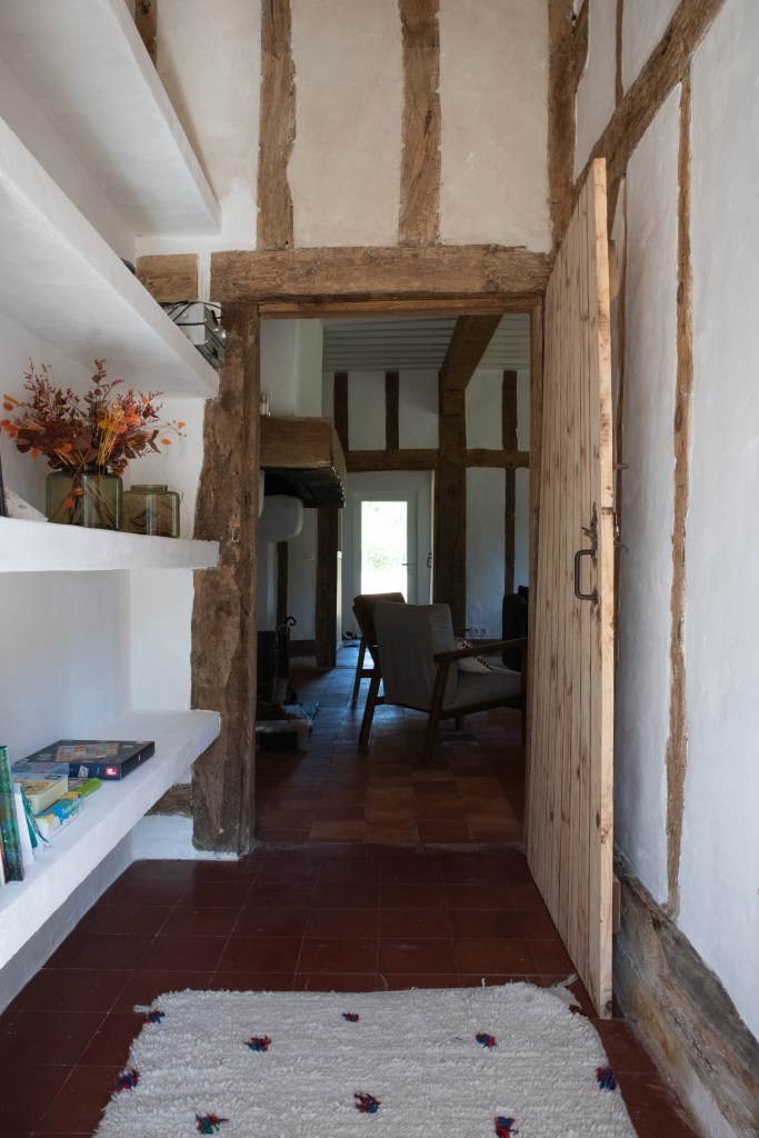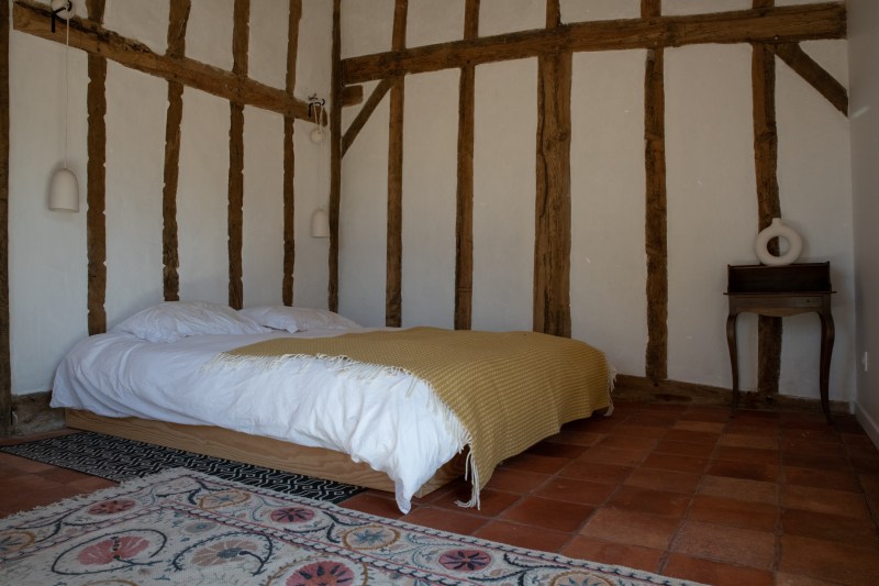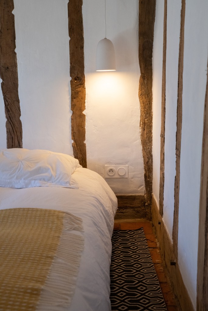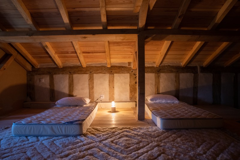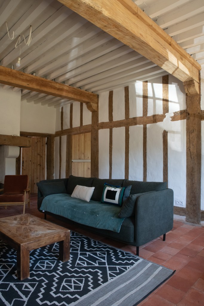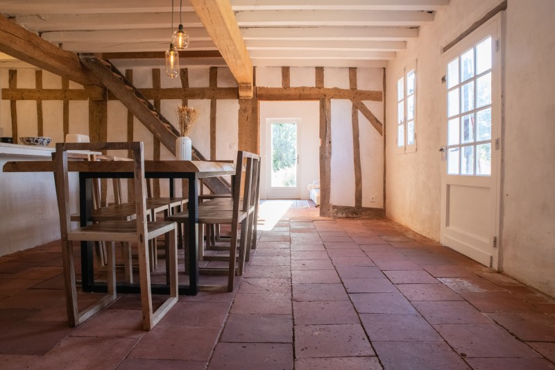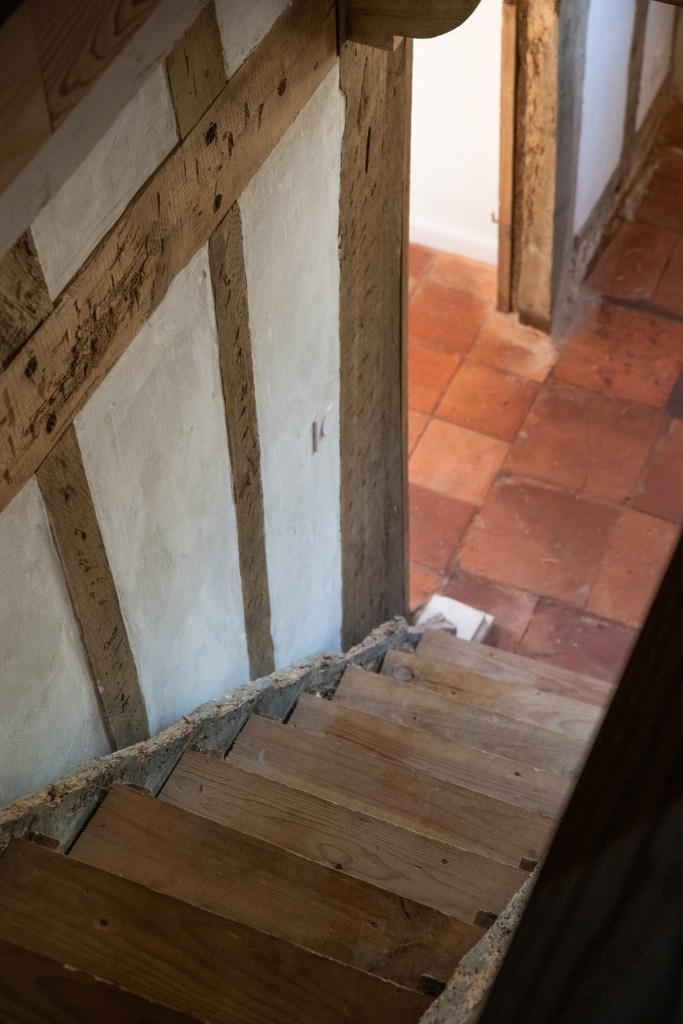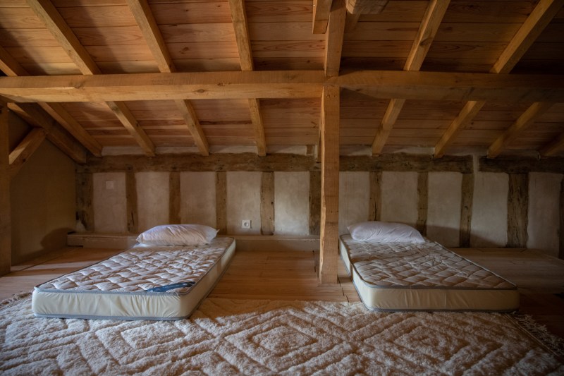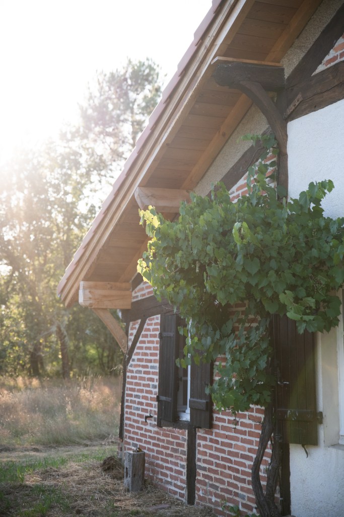 Tussen de grote houten balken die overal in het huis terug te vinden zijn, wordt torchis geplaatst om op die manier een muur te vormen. Torchis is een soort beton dat van oudsher veel gebruikt wordt voor het fundament van de traditionele huizen in deze streek. Beter bekend als ‘La maison Landaise’.